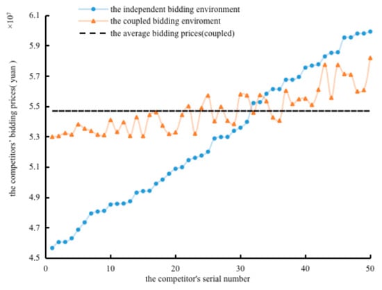 The bidding prices of competitors in the coupled bidding environment are calculated and compared with the independent bidding environment as shown in Figure 8. The bidding prices optimized by the coupling environment are more concentrated near the average value than the initial price. This is because the competitor I is more inclined to make decisions to reduce the internal deviation value of the group to improve the winning probability by predicting other prices.