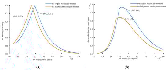 Under the coupled bidding environment, the trend of the winning probability and the weighted option value are calculated, and the comparison with the trend in the independent environment is shown in Figure 9. In both bidding environments, as the bidding price increases, the winning probability and the weighted option value both increase first and then decrease. The optimal price in the coupled competitive environment is significantly higher than that in the independent environment. This is because, in the coupled bidding environment, the enterprises can reduce the degree of group deviation by improving the rationality of the group bidding environment prediction, so that the bidding price is closer to the group characteristics. Therefore, the winning probability and the weighted option value by the winning probability also tend to rise, and the bidding price corresponding to the maximum weighted option value, that is, the optimal price, increases accordingly. The optimal price increased by about 2.37%, and the corresponding winning probability and the weighted option value increased by about 9.36% and 28.03%, respectively.