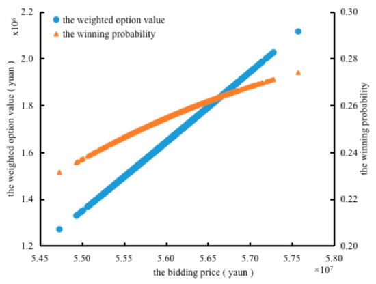 When other conditions remain fixed, the option value increases continuously with the higher bidding prices. In other words, without considering the impact of bidding prices on the winning probability, the enterprise will obtain greater benefits with the higher bidding price. However, in the group bidding environments, the option value must be weighted by the winning probability.