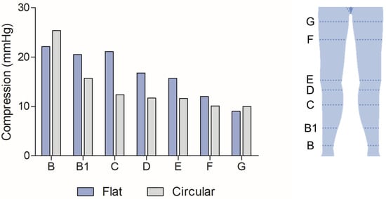 In this sense, in our study composed of women with lipedema, the participants of the control group did not employ compression tights before their inclusion in the study and during the study in comparison with the groups that wore compression tights along the study, which also employed compression garments before the study. However, no differences between groups were observed in rest skin temperature in the first and the second test. These results are in agreement with the results of previous studies that compared in a healthy sample the skin temperature between groups with compression garments and generic garments without compression [31,32]. In our study, the only difference observed was in the flat knitting group in the popliteal fossa ROI (p = 0.042), where the skin temperature in the second test was lower than the first test. This effect probably was a random effect because it happened only in one ROI and in one group. However, this fact could be produced by the difference in the values of compression between their compression tights and the prototypes of the study. In the development of the prototype, it was paid attention by AITEX to comfort and perspiration, and the values of compression obtained were lower than the own tights of participants that used therapeutical compression tights (Level CCL2). According to the data provided by the Technological Institute of Textile (AITEX) (Figure 3), circular knitting compression tights have the greatest declining compression in the lower leg in comparison with flat knitting compression tights (circular b1: 62%, c 49%; d 46% vs. flat b1: 93%; c: 95% d: 76%). This idea must be analyzed in other studies to identify the effect of the compression level and the percentage of compression in skin temperature.
