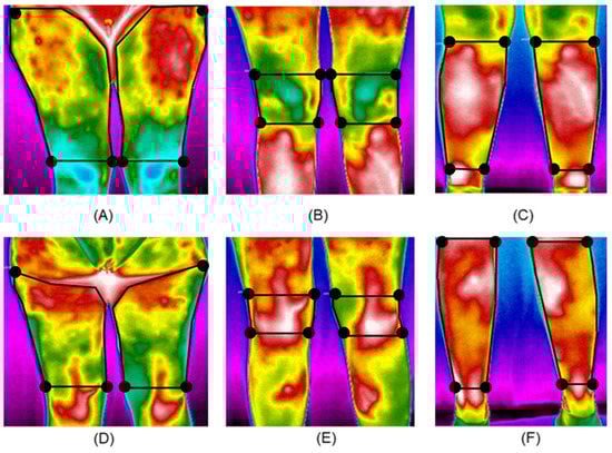 ROI’s delimitation in the lower limb: (A) anterior thigh; (B) knee; (C) anterior leg; (D) posterior thigh; (E) popliteal fossa; (F) posterior leg.