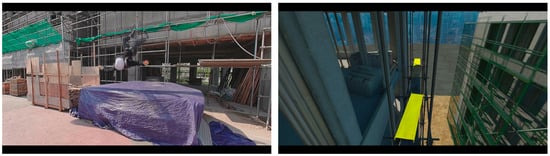 We conducted a survey in April and March 2021 on workers currently working at construction sites in South Korea. The survey was conducted in-person and prior to the survey, all respondents completed a VR safety training wherein they experienced common workplace accidents and were instructed in safe working procedures to prevent such accidents. The VR training was conducted using an Oculus VR HMD and the contents of the training were developed by the Korea Occupational Safety & Health Agency (KOSHA) [51]. An example of the VR screenshot is presented in Figure 2.