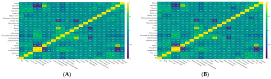 Although the four feature tables generate similar heat maps, some differences are worth mentioning. In Figure 1C, there is a negative correlation (−0.2) between military service and dropout, while positive correlations (0.2) appear in the rest of the graphs. The heat map in Figure 1C represents the generation method of the feature table based on the student data of the first semester. This means that in this feature table, only the data for each student’s first semester will be calculated. For these students, if they have served in the military, it means that the student served in the military before formally enrolling in the university. Therefore, it can be argued that these students’ university studies were not “interrupted” by military service, and thus they were less likely to drop out (military service is negatively associated with dropout).