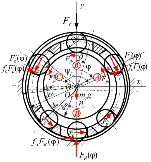 where —cage weight, —cage with the ring friction coefficient, —cage with the rolling element friction coefficient, —cage eccentricity, —outer ring diameter, —rolling element center diameter, —rolling element diameter, —bearing ring groove radius, —bearing contact angle.