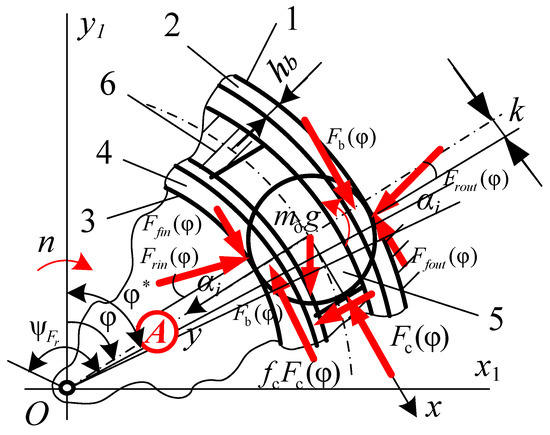 The rolling element of mass , driven by the friction force from the side of the moving inner ring , perceives the resistance of the friction force from the side of the stationary outer ring, the forces of interaction with the cage jumper , and moments from the components of the external load . The system of equations of motion of such an element at the exit from area A of zone (see Figure 2) can be written as follows: