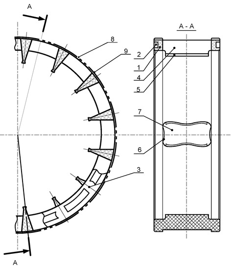 With the help of the obtained model, an energy efficiency analysis and modernization of the cage of the cylindrical roller bearing type 2726, installed in the support nodes of the wagons, were carried out. An improved design of the polymer cage was proposed [29]. The cage of a cylindrical roller bearing that contained two rings 1, with cavities 2, and transverse partitions 3, the number of which is equal to the number of pockets 7, partitions 4 with stepped protrusions 5, which is distinguished by the fact that all sides of the seats 7 have a three-wave contour 6, and the convex surfaces of the contours are located in the middle of the cylindrical surfaces and the ends of the rollers, and two or more micro-indentations 8 are made on the friction surface 9 of the rings on the side of each pocket (Figure 3).