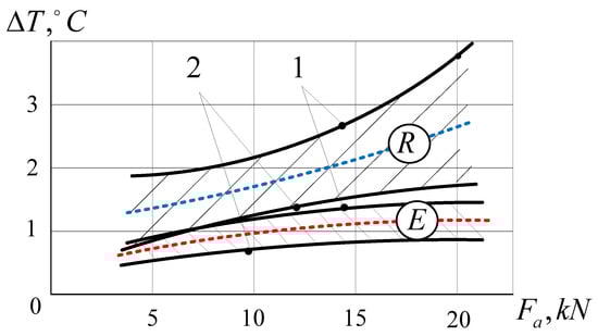 The temperature gradients diagrams for a typical design of a cylindrical roller bearing (region R, z = 14) and a modernized one (region E, z = 16): curve 1—2—.