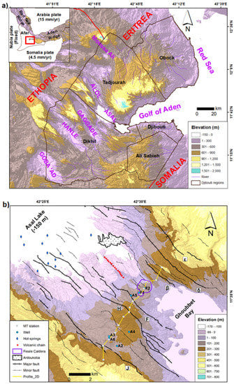 Topographic and main structural elements of (a) Djibouti and (b) Asal rift. The red rectangle is Djibouti; Greek characters represent the name of major normal faults; MT: Magnetotelluric (modified from [6]).