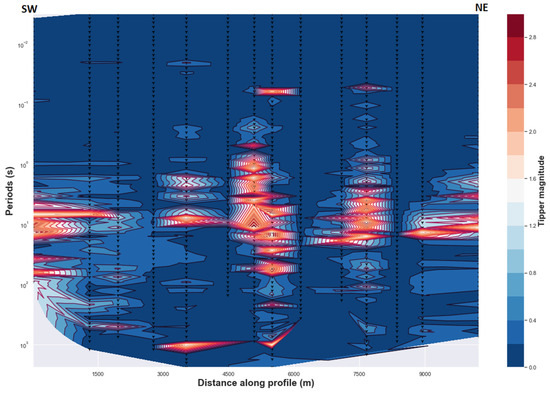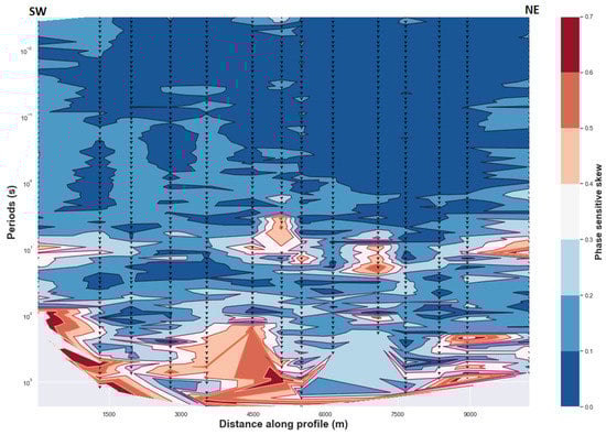 In order to determine the absence of dominant 3D regional conductivity and generalize the presence of dominant 2D regional conductivity in the study area, values of the regional skew were analyzed. It is reasonable and safe to advance that a 2D regional conductivity structure can be considered in this study as there are few points that have a regional skew value greater than 0.3 (Figure 2). Some points with greater regional skew are likely due to the influence of uncertainty in MT fields or impedance estimates (see Appendix A). A relative increase in regional skew values with depth can demonstrate the deviation of the conductivity distribution from the ideal or the exact 2D conductivity structure where the diagonal elements of impedance tensor are neglected and should be zero or close to zero [21,29]. Increasing values of the regional skew for the intermediate and long periods (corresponding to the greater depth) can be interpreted as due to the presence of anisotropic layers as suggested in previously studies by [28,37] with an assumed 2D resistivity structure. It is also correlated with the high vertical gradient magnitude induction vectors (see Section 4.2.3). Consequently, it is very interesting to suggest that anisotropy exists for the area where both the values of regional skew and the magnitude of the tipper increase. In addition, a phase split, ellipticity and a well-defined geoelectric strike exist for the same periods range, which also support the presence of anisotropy at the corresponding depth.