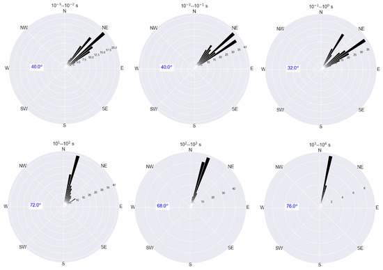 Rose diagram of the orientation of the phase tensor strike for the stations along 2D profile (Figure 1) where each rose diagram corresponds to the mean strike estimated over all 14 MT stations along with the corresponding period range.