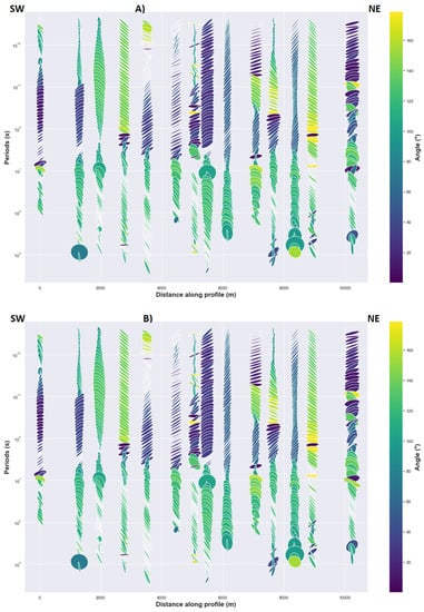 Dimensionality analysis is a useful way to understand whether a 3D, 2D or 1D conductivity model should be developed to fit the data. This is carried out through common analysis methods used by the MT community such as phase tensor, invariant impedance tensor, decomposition model and induction vectors [21,22,23]. Thus, to determine if the Earth can be approximated by a 2D conductivity structure, in the following sections the presence of a well-defined geoelectric strike will be investigated, which can be a good argument to assume a regionally 2D conductivity structure.
