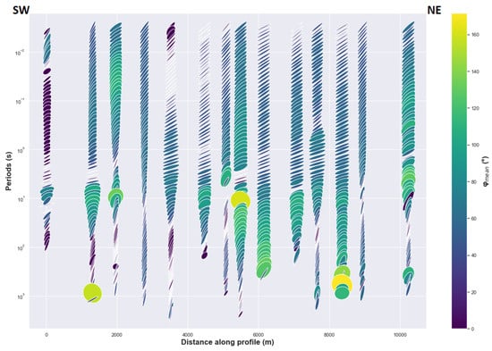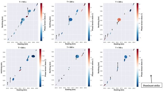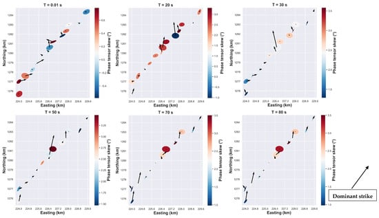 Tipper vectors represent the relation between the vertical magnitude field to the horizontal magnitude fields. Furthermore, lateral conductivity variation induces variation of horizontal magnetic fields, which generate a vertical magnetic field. The tipper vector as illustrated in Figure 5 have a magnitude and direction that varies with period and with site location. For short periods, vectors with strong magnitudes are observed in the center of the rift and in the south-west. The orientation of the tipper angle is approximately N45°E for the stations located in the south-west, while for the sites located at the center, the tipper angle is close to north-north-east and sometimes close to the north-south direction. Furthermore, for the long periods, the features are almost the same for sites located in the center and in the south-west, where the high magnitude vectors are aligned close to the north-south direction. The induction vectors are weak in the case of dominant 1D resistivity structure as evidenced in Figure 5 for some MT sites. In addition, the circular form of the ellipse of those sites indicates the dominant 1D structure (Figure 5, see for reference [22]). The filled color of the ellipse corresponds to the skew angle, which is commonly used to infer the presence of 3D effects where values greater than 5° are generally linked to the existence of 3D effects [25,38]. In Figure 5, values less than 5° of skew angle are common and could be associated with the dominant 2D regional conductivity structure [22]. Another important element is that the principal axes of the ellipse are either parallel or perpendicular to the geoelectric strike direction in the presence of dominant 2D conductivity structure [24].