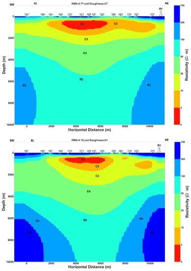 Prior to performing a 2D inversion, a mean geoelectric strike of N45E direction was considered for the inversion models. Then, different inversions models were performed separately. Thus, inversion models of (TM): transverse magnetic field parallel to the structure or B polarisation, (TE): transverse electric field parallel to the structure or E polarisation, invariant model and (TE-TM): joint inversion of TE and TM modes, were run and data are rotated to a mean strike of N45E. The choice of geoelectric strike is not relevant for the derived apparent resistivity from the invariant impedance tensor as the quantity is invariant under any rotation angle and remain the same regardless of the geoelectric strike/rotation angle [26,41]. Inversion code performing Occam philosophy with finite difference mesh was used. This code is Occam2D and is an open-source tool which is available on MTNet. The number of MT stations inverted is 14 as showed by the 2D profile across the rift in Figure 1. The width of mesh cell is fixed at 100 m where the number of total layers is 100. The initial model was set to a homogeneous half-space with a resistivity of 100 Ωm. Another inversion model with an initial homogeneous half-space of resistivity of 10 Ωm was tested. The best final 2D inversion that fitted the data with the lowest RMS misfit was selected, which corresponds to the initial model of homogeneous half-space of 100 Ωm.