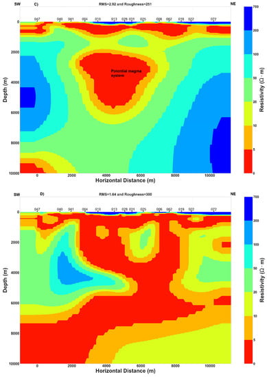Results of two joint inversion of TE–TM data, one rotated to the geoelectric strike N45°E (Figure 9) and another one rotated to the geoelectric strike N120°E (Appendix A) display high conductivity areas at great depth. Those results with the 2D inversion models of TM, invariant and the TE model (Figure 9) have some similarities and consequently, regional 2D conductivity structure approximation can be considered to explain the subsurface geoelectric structure beneath the Asal rift.