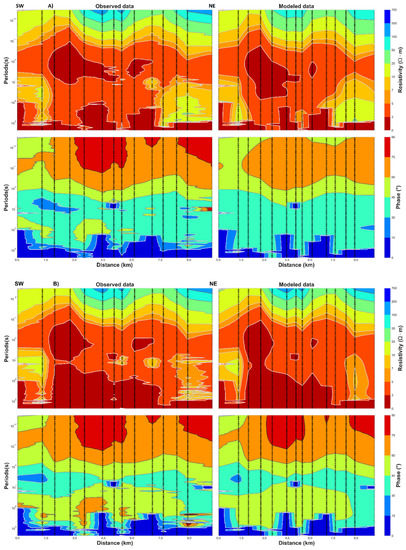 Observed vs. modeled apparent resistivity and phase data. (A) for the TM data and (B) for TE−TM data.