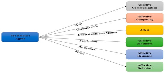 Affective Computing (AC) is perhaps the most recent unit of computer science, having emerged with Rosalind Picard’s paper [6,7]. It is a rapidly growing interdisciplinary field that combines analysts, researchers, and experts from various fields, including psychology, sociology, artificial intelligence, natural language processing, and deep learning [8,9]. However, it does not appear easy to imagine how humans can work seamlessly with machines and IAs. AC enables IAs to process data gathered from various sensors to assess an individual’s emotional state, ranging from unimodal analysis to increasingly complex forms of multimodal research [10]. Emotional intelligence (EI) is perplexing from a human perspective, and there is no exact rational explanation or theory. The critical foundation for AC is understanding emotions and their role in human behavior and cognitive processes [11,12]. In the development of AC-based frameworks, pattern recognition and examination techniques are used to recognize and synthesize facial patterns and generate an Emotional Response (ER). It encompasses various facets as shown in Figure 1 [8,13,14].