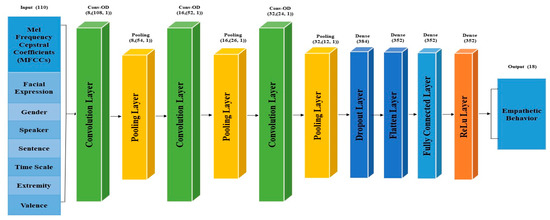 Different examinations have indicated that ODCNNs are advantageous and desirable for specific applications over their TDCNN partners in managing OD datasets for the accompanying reasons. For our proposed work, the input dimension is set as 110, including 100 diverse MFCCs, energy, zero crossing rate, pitch, facial expression, gender, speaker, sentence, timescale, extremity, and valence, and the output dimension is set as 1, which is emotional behavior, wherein the input length is 3078. The training dataset consists of 70% of the instances, and the rest of the 30% is used for testing purposes. The ‘Hinge’ loss function and the ‘Adam’ optimizer are used. The accompanying parameters shape the arrangement of the ODCNN [41,42,43]. As previously explained in Algorithm 1, Figure 5 shows the different types of layers that are utilized in ODCNNs: