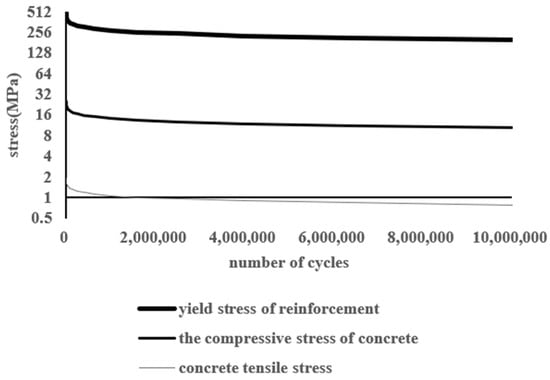 As shown in Figure 6, the abscissa cycle times represent the times of repeated application of aircraft load, and the ordinate represents the yield stress of the reinforcement under the application of the repeated aircraft load, the tensile stress of concrete on the lower surface of the bridge deck, and the compressive stress of concrete on the upper surface of bridge deck along the action line of aircraft. From the three stress–life curves, it can be seen that the material strength of the concrete and reinforcement sharply decreases in the first 1 million cycles, and the decline rate greatly slows down in the process of the first 1 million to 10 million cycles, thus providing an effective idea for the application of subsequent loads and the study of the fatigue characteristics of the taxiway bridge during fatigue analysis. Firstly, the aircraft sorties passing through the bridge deck in a year are counted, and then the annual sorties are converted into operation times, corresponding to the S–N curves of the reinforcement and concrete materials to obtain the fatigue strength parameters of the two materials, which are then inputted into the simulation software for operation purposes to obtain various strength check indexes of the taxiway bridge under the fatigue state, such as maximum deflection, stress value, strain value, etc. Moreover, checks are made to determine whether the fatigue strength of the bridge meets the operation requirements of the current model.