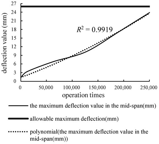 The maximum deflection value in the middle of the span of 0–255,500 operations is derived, and the correlation between the maximum deflection value in the middle of the span and the operation times is analyzed [34]. The relationship is as follows: