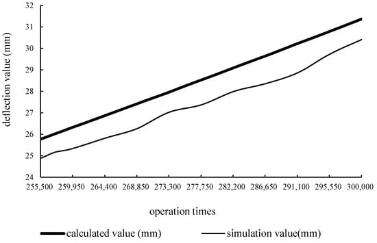 To verify the reliability of the above formula, the operation times to 300,000 sorties extract the data every 4450 sorties, and the deduced value of the relationship can be compared with the simulation output value of the FEM. Thus, the following curve can be obtained as shown in Figure 8: