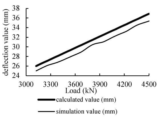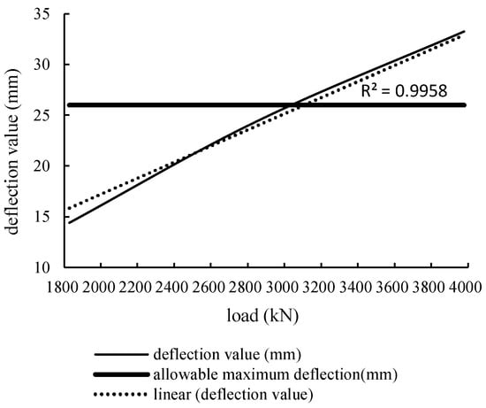 With the increase in load, the maximum deflection at the mid-span increases linearly, and the correlation coefficient R2 = 0.9864, indicating that the correlation degree of the curve to the data is as high as 98.64%. According to this relationship, the allowable maximum deflection value Y = 26.03 mm, the load Qt = 3121.33 kN can be obtained, indicating that the standard aircraft type needs a load reduction, and the maximum can only operate 255,500 times with the load value of 3121.33 kN to ensure the safe passage of the aircraft.