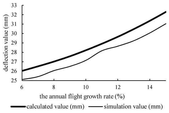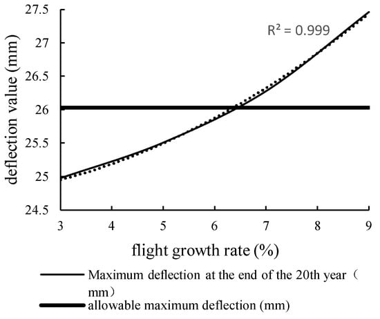 - Considering the different traffic growth rates, taking the average annual 12,775 sorties as the initial value, the maximum deflection value of bridge deck was extracted when the annual growth rate of flights reaches 3%, 5%, 7%, and 9%. The mathematical relationship between the annual growth rate of departure flights and the maximum deflection value of the mid-span after 20 years was derived. It was calculated that, when the annual growth rate of flights is 6.3066%, the maximum deflection value in the life cycle of the taxiway bridge reaches the allowable maximum deflection value.