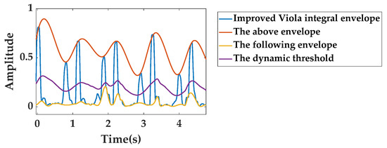 On the other hand, for the extracted envelope, the upper envelope and lower envelope were extracted using a similar empirical mode decomposition. The upper and lower envelopes were averaged to obtain the dynamic threshold, as shown in Figure 4. The purple line represents the dynamic threshold.