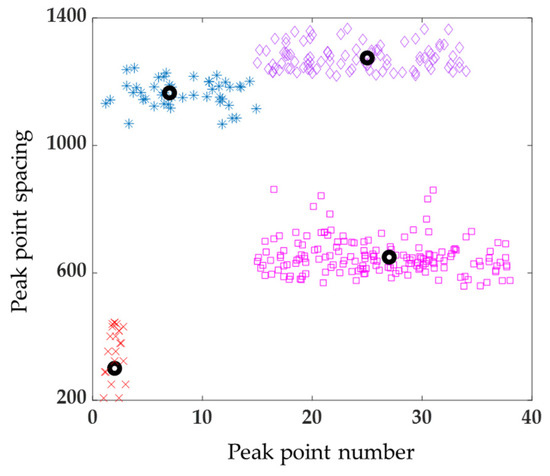A drawing of the K-means clustering effect is shown in Figure 5. The four colors represent four chosen categories. Black dots represent their respective clustering centers. Red cross-symbols are redundant anchor points. Magenta squares are the category of spacing from S1 to S2. Blue asterisks and purple rhombi are the types of spacing from S2 to S1. There are redundant points in the diagram but no missing points.