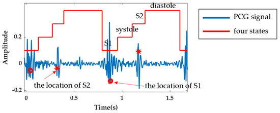 Heart disease is the leading cause of death worldwide. Cardiovascular disease is the number one causative factor threatening human life and health [1]. Heart sounds carry early pathological information about cardiovascular diseases [2], which is important for early warning and detection of cardiovascular diseases. Each contraction and relaxation of the heart constitutes one cardiac cycle. A normal heart sound is divided into the first heart sound (S1) and the second heart sound (S2) in each cardiac cycle, as shown in Figure 1. By extracting the features of S1 and S2, early warning and diagnostic modeling of cardiovascular diseases can be achieved [3]. How to accurately segment the heart sound signals is the first and most important step in heart sound modeling. However, heart sound segmentation is a difficult problem due to the non-stationarity of heart sounds and the influence of background noise (including real-world noise and other artificial noise) [4]. In addition, due to the physiological and pathological information in the cardiac cycle, in some pathological PCG signals it is challenging to locate both S1 and S2 [5].