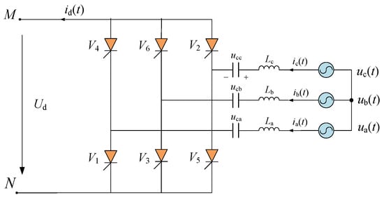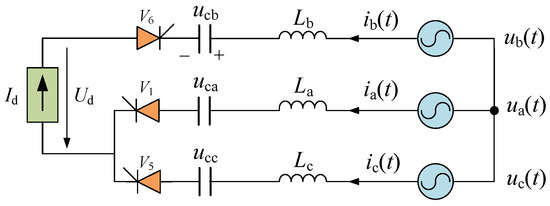 For a CCC, capacitors are inserted between the converter transformer and thyristor valves. Thus, the determination of the capacitance value is important for the main circuit parameter design. To analyze the characteristics of the CCC, a six-pulse CCC equivalent model at the inverter side is arranged in Figure 2.