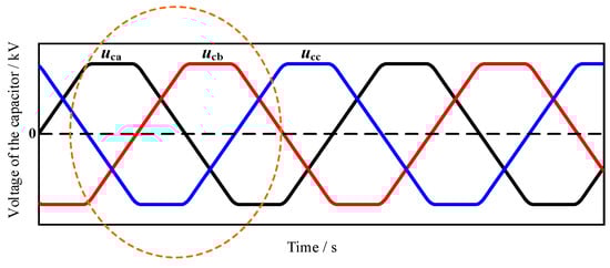 The voltage waveforms of the commutation capacitors for a six-pulse CCC are shown in Figure 3. The three-phase capacitor voltages uca, ucb and ucc present periodic changes. To further explore the voltage change in the capacitor in the commutation process and the non-commutation process, the commutation capacitor voltage waveforms of phase A in Figure 3 is partially enlarged, as shown in Figure 4.