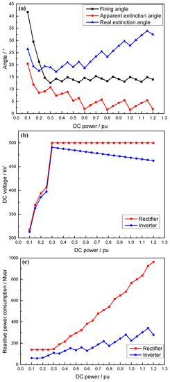 With the DC power changes from 0.1 pu to 1.2 pu, the firing angle/extinction angle, the DC voltage, the reactive power consumption and the tap position are shown in Figure 7.
