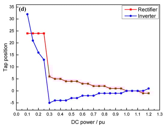 Step 5: For the rectifier, the default tap position of the converter transformer is set at the highest position. At the highest position, the corresponding firing angle and the reactive power consumption are smaller. Thus, the valve stress is reduced and the harmonic currents are diminished, which is beneficial for security and stability.