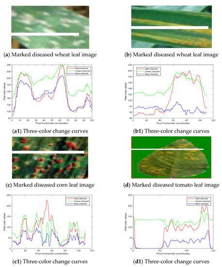 In order to segment the lesions in the collected images, the color information should be used to analyze the variation rules of the different color components in different color spaces. In the RGB color space, through the analysis of the color components of R, G, and B in a large number of diseased leaves, it was found that the red component changes the most during the transition from a normal leaf to a diseased leaf. The color changes of R, G, and B in a1, b1, c1, and d1 in Figure 2 correspond to the values of R, G, and B of the white line pixels in a, b, c, and d in Figure 2, respectively. Since the white line of the mark includes both the normal leaf pixels and the diseased leaf pixels, the color with the most obvious change was found by analyzing the three-color change curve. As can be seen from Figure 2, the red R-value of the normal area is small, but the red R-value of the diseased area increased suddenly and even reached the maximum value among the three colors, indicating that the difference between the red R-value of the pixel of the normal leaf area and the pixel of the diseased leaf area is the largest, which could be used as the basis for the segmentation of the diseased image.