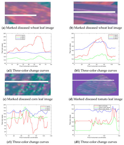 Images a, b, c, and d in Figure 3 are the diseased leaf images in the lab color space. Images a1, b1, c1, and d1 in Figure 3 correspond to the l, a, and b three-component change curves of the pixels in the white lines marked in the original images. The three-component change curves of l, a, and b show that the values of brightness l in the normal leaf are small but suddenly increase in the lesion, even reaching the maximum in the three components. So, from the normal leaf to the lesion, the brightness is the largest amplitude change in the three components, while chroma a and chroma b change relatively gently, which indicates that the difference between the brightness L values of the pixels in the normal areas and the brightness L values of the pixels in lesions is the largest, which could be used as the basis for the image segmentation of the diseased leaves.