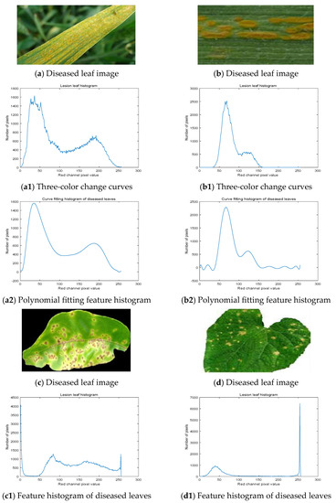 The number of clusters and the cluster centers of the clustering algorithm were automatically obtained by fitting the characteristic histogram of the R-channel. Through analyzing a large number of collected leaf image features, the results showed that the diseased leaf images usually had two composition modes: the first was that the diseased leaf image consists of diseased spots and leaves, while the second was that the diseased leaf image is composed of three regions: the lesion, leaf, and background. Therefore, most of the diseased leaves showed a bimodal or triplet feature on the histogram. The As are shown in a1, b1, c1, and d1 in the Figure 4 diagrams of the diseased leaf red channel histogram. The corresponding diseased leaf images are shown in Figure a, b, c, and d in Figure 4. The different peak areas of the red R histogram represent the different areas of the diseased leaf image, and the peak points of the peak area represent the pixels that appeared most frequently in this area.