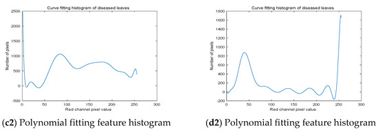The feature histogram curve of the polynomial fit is shown in a2, b2, c2, and d2 in Figure 4. After finding all the peak points of the feature histogram fitting curve, we found all the peak areas of the diseased leaf histograms and roughly found the different areas of the diseased leaf. The peak point was used as the initial clustering center to cluster the diseased leaves. Therefore, according to the peak area and peak point of the feature histogram, the cluster number and cluster center of the diseased leaves could be preliminarily determined.