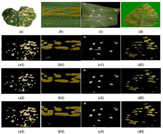 Lesion segmentation results based on different algorithms. (a) Diseased leaf image. (b) Diseased leaf image. (c) Diseased leaf image. (d) Diseased leaf image. (a1) Segmentation results with the K-means method. (b1) Segmentation results with the K-means method. (c1) Segmentation results with the K-means method. (d1) Segmentation results with the K-means method. (a2) Segmentation results with the mean shift method. (b2) Segmentation results with the mean shift method. (c2) Segmentation results with the mean shift method. (d2) Segmentation results with the mean shift method. (a3) Segmentation results using our method. (b3) Segmentation results using our method. (c3) Segmentation results using our method. (d3) Segmentation results using our method.