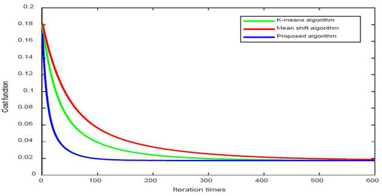 Table 2 compares the performance of our algorithm with the K-means and mean-shift algorithms in terms of the running time, number of iterations, and segmentation accuracy. As seen in Table 2, this algorithm has the lowest execution time and iteration time, followed by the K-means algorithm. Especially in terms of the iterations, the iteration time of our algorithm is less than half of the K-means and one-third of the mean shift algorithm. Figure 6 shows the average iterative convergence time of the three algorithms. The number of iterative convergences of our algorithm is 145, while that of the K-means algorithm is 352, and that of the mean shift algorithm is 474. Therefore, the iterative convergence rate of our algorithm is much faster than the other two algorithms.