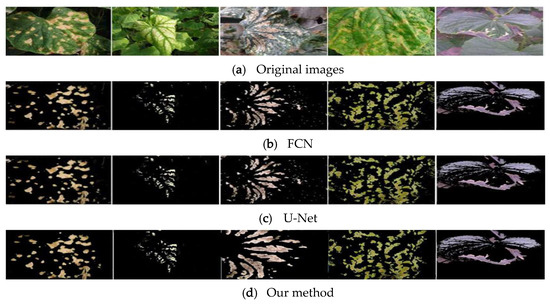 Table 3 compares the performance of our method with the FCN and U-Net segmentation algorithms based on deep learning. In the experiment, 100 diseased leaf maps were used for testing, and the segmentation results were statistically analyzed. It was seen that this algorithm is superior to other methods in every index. Figure 7 shows the segmentation results of some diseased leaf images. It was seen that FCN has the worst segmentation effect, and the diseased area could not be completely segmented, which may have led to over-segmentation and under-segmentation. U-Net could segment the contours of the diseased areas in the leaves but could not segment the boundaries of the diseased leaf. The algorithm in this paper could segment the diseased area effectively and could accurately segment the boundary and details of the diseased leaf, which fully proves the effectiveness of our method in this paper.