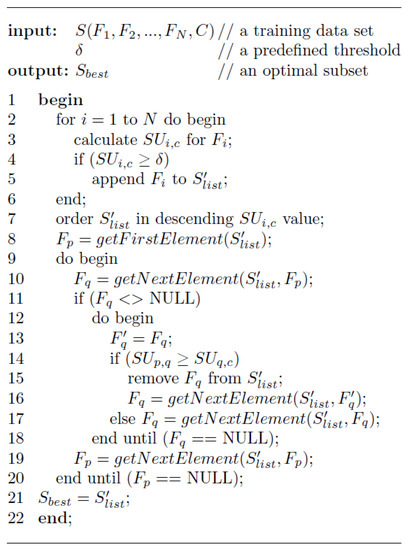 In this phase, the dataset is split into two subsets: the first subset contains 70% of the whole dataset for training, and the second subset includes 30% for testing. The first subset is used to generate the optimal set of attributes. The feature selection method called fast correlation based filter (FCBF), FCBF is a filter selection for high dimensional data and can remove a large number of features that are redundant. FCBF is used to reduce the attributes based on the pairwise correlation between each attribute and the decision attribute [33], as shown in Figure 4.