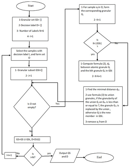 The rule induction technique is used in granular computing to emulate the supervised machine learning methods used to classify the dataset. In rule induction, a set of rules (r1, r2, …, rm) is expressed to map the input space to the output space. Each rule consists of a logical implication, and the results become valid if the prediction is satisfied [28,29]. AQ-family [30] and CN2 [31] are examples of traditional rule induction methods. In GrC, every rule, ri, is associated with a certain subset of instances; it might be considered a granule from the GrC point of view [27].