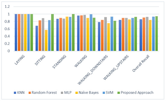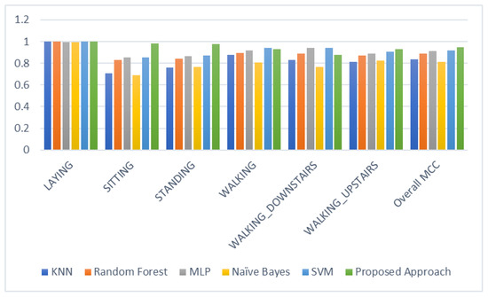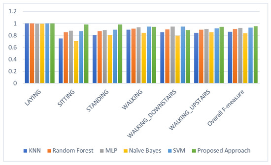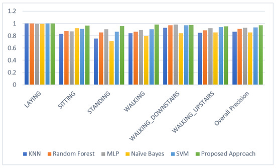 In this section, the approach for human activities using a granular computing classifier is evaluated versus traditional machine learning classifiers, i.e., KNN, Naive Bayes, MLP, Random Forest, and SVM. The granular computing classifier outperformed traditional machine learning classifiers. The evaluating metrics that are used in making comparisons include precision [38], recall [38], f-measure [38], and Matthews correlation coefficient (MCC) [39]. In fact, the approach can achieve correctly classified objects better than other traditional machine learning classifiers. As shown in Table 2, the percentage of correctly classified objects using our approach is 94%. However, the percentages of correctly classified objects for KNN Naive Bayes, MLP, Random Forest, and SVM are 86.1%, 84%, 92.7%, 90.7%, and 93.2%, respectively. Table 3 shows the detailed accuracy of candidate classifiers per class. It consists of six activations: lying, running, standing, walking, stepping upstairs, and stepping downstairs. It reports the activity precision per row, and the last row concludes the overall precision of each algorithm over all activities. Table 3 emphasizes that the precision values of traditional machine learning classifiers are less than our approach in all activities as well as the overall precision shown in Figure 7. Table 4, Table 5 and Table 6 compare among candidate activity recognition solutions in terms of recall, f-measure, and MCC based on each activity as well as overall recall, f-measure, and MCC values. These tables indicate that SVM outperforms the approach for two activities: walking and walking downstairs. However, the approach has the best recall, f-measure, and MCC for the other 4 activities as well as the best overall average of activities. Moreover, Figure 8, Figure 9 and Figure 10 depict bar chart comparisons of candidate solutions in terms of recall, f-measure, and MCC, respectively. Finally, Table 7 indicates the overall processing time in seconds required for each classifier in both the learning and testing phases. The processing time of Naive Bayes is the minimum. However, the approach comes in third place after the Naive Bayes and SVM algorithms. Therefore, it has an acceptable processing time.