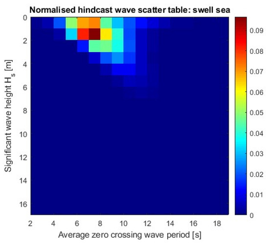 The monthly files (netCDF file format) required for the study were downloaded to the local system and striped for parameters shown in Table 1 for the North Atlantic Sea. The temporal data of the North Atlantic Sea area were saved under individual sea area numbers, i.e., 8, 9, 15 and 16, to reduce the size of individual files. To further reduce the size of the file and for fast processing, each monthly sea area file was reduced to a monthly WST for wind, swell and mean sea using an in-house-developed algorithm. The algorithm is capable of developing WSTs for customised sea regions, including customised time for wind, swell and mean sea. The individual monthly WST is a 25 by 25 matrix and is stored in a structured format to m.files, which is used for further analysis in this study. The data set developed is a simple way of looking into the sea state contribution of swell, wind and mean sea.