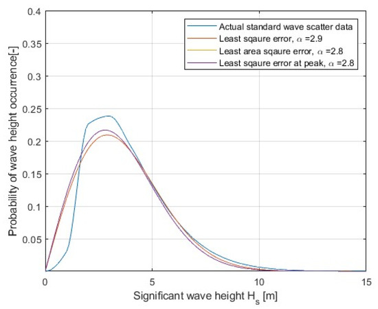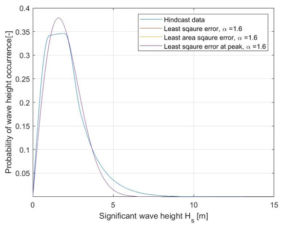 For the comparison study of the WSTs, the probability of wave occurrence is summed with respect to wave height to plot the probability density function (pdf) vs. wave height for each WST. In order to carry out a quick comparison of WSTs regarding the regional and seasonal WSTs, each WST’s pdf corresponding to the Rayleigh pdf function is mapped, and the Rayleigh shape parameter () is compared to identify the variation in WSTs. To carry out the mapping of the Rayleigh pdf to match the hindcast WST’s pdf, the following three techniques were used: (i) least square error method (LSE), (ii) least area error method (LAE) and (iii) least square error method for the peak of the curve (LSEP). The peak of the curve is the region above the mean probability of exceedance (MPoE) calculated using Equation (3). The smaller Rayleigh shape parameter means the spread is narrow with a sharp peak located closer to the lower wave height, while the larger shape parameter means the pdf is broad and flat and the peak of the pdf is towards the higher wave height.