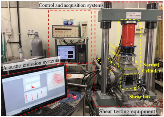 We used the servo-controlled direct shearing device for tests in the present research, as shown in Figure 2. This apparatus is composed of a mechanical loading system, a control system, and a data processing system. This apparatus can be servo-controlled to achieve various normal stiffness conditions with good precision. More detail of the configuration of the apparatus was reported by Jiang et al. [23].