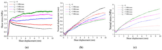 Figure 4b shows the normal displacement versus shear displacement curves. The normal displacement decreases to negative values at initial shearing; after the minimum normal displacement is reached, shear dilation occurs until the shear displacement reaches 10 mm. The dilation was decreased by increasing normal stiffness. This is because the increase of normal stress induced by normal stiffness restrains the increment of dilation. The bows of normal stress against shear displacement are shown in Figure 4c. For CNL conditions, the normal stress remains unchanged during shear, while the variations in normal stress are proportional to the case of normal shift at the CNS status.