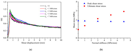 The relationship between normal stiffness and SRI and shear strength of joints. (a) Relation between SRI and shear displacement of the structural plane. (b) Variation of peak and ultimate shear stress for joints under different normal stiffness conditions.