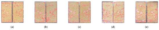 Failure modes of joints with different shear rates under CNS conditions. (a) Shear rate = 0.5 mm/min; (b) Shear rate = 2.5 mm/min; (c) Shear rate = 5 mm/min; (d) Shear rate = 10 mm/min; (e) Shear rate = 20 mm/min.