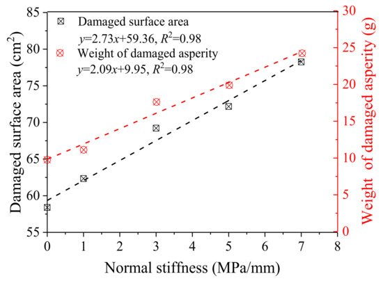After the test, the gnawed rough body and friction-based fine powder on the joint surface were collected and weighed to obtain the joint failure rough weight under diverse normal stiffness statuses, as displayed in Figure 7. When the normal stiffness is 0,1,3,5 and 7 MPa/mm, the weight of the joint failure rough body is 9.88, 11.24, 17.74, 20.02, and 24.35 g, respectively. With the increase of normal stiffness, the weight of joint failure roughness increases linearly.